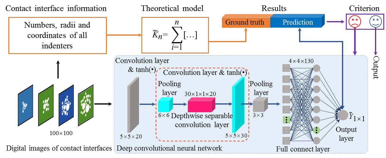 李翔宇教授课题组针对该问题,构建了深度学习模型(图2),从图案化的角度预测具有复杂非规则构型接触界面的接触刚度。在网络架构方面,设计了具有特征融合能力的深度可分离卷积层,来表征非规则压头间复杂的弹性相互作用;在特征评价方面,引入图案的复杂度指标,从样本构型的复杂程度来量化和确保样本的几何多样性;在模型性能评估方面,通过系统的压痕实验检验深度学习模型的预测精度和泛化能力。