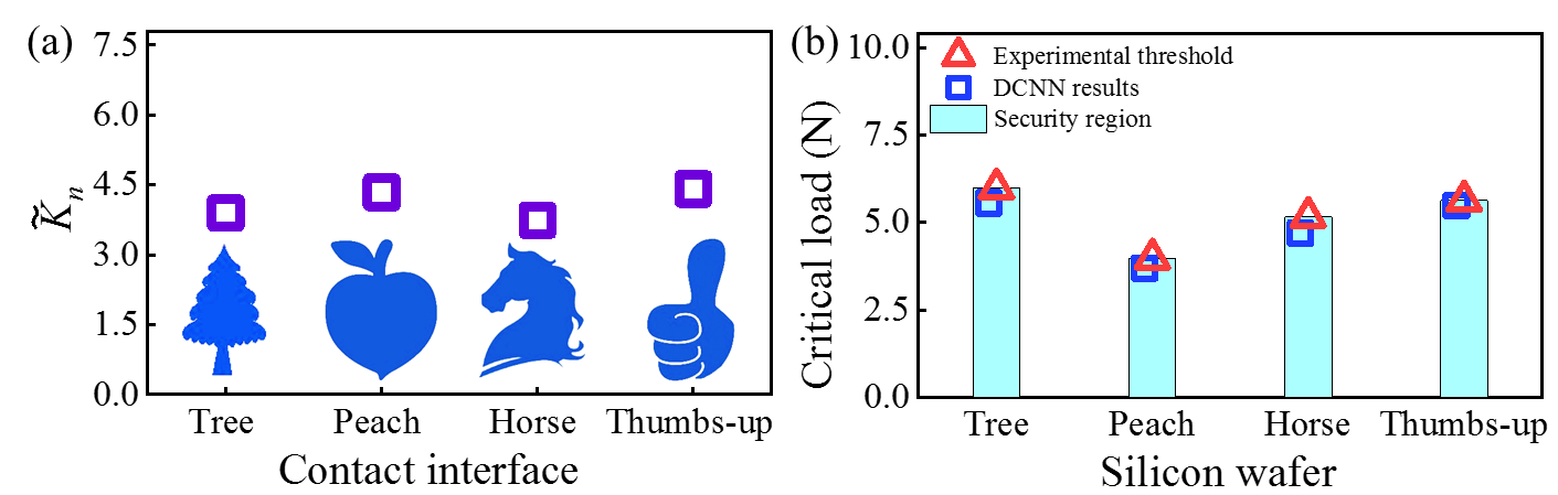 图5. 通过硅片的拾取实验验证当前的深度学习模型(DCNN)。 (a)当前模型预测的具有定制化“树状”、“桃子”、“马头”和“点赞”图案接触界面的归一化接触刚度Kn。(b)当前深度学习模型确定的具有定制化“树状”、“桃子”、“马头”和“点赞”图案硅片的临界载荷。