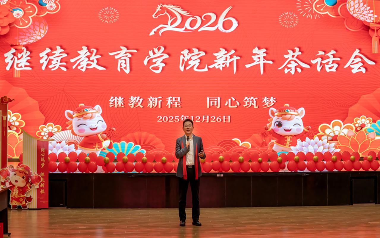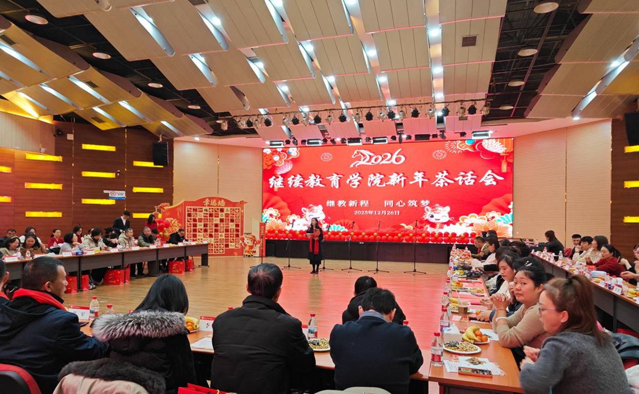 新年将至,岁序更新。为传承学院优良传统,凝聚发展共识,汇聚奋进合力,12月26日下午,继续教育学院在国际会议厅举办“继教新程·同心筑梦”主题新年茶话会。学院党总支书记马琼、院长陈民武、党总支副书记程军、副院长贺强、潘昱、王克贵及全体教职工欢聚一堂,共叙深厚情谊,共话发展蓝图,为2026年学院事业发展拉开温暖而坚实的序幕。