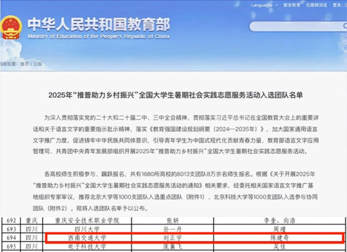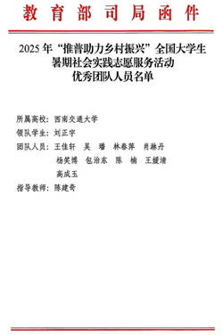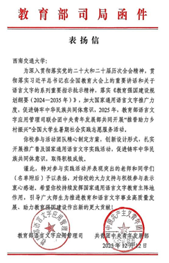 2025年,教育部语言文字应用管理司联合团中央青年发展部共同开展“推普助力乡村振兴”全国大学生暑期社会实践志愿服务活动。西南交通大学经济管理学院“言传凉山普,语通四方情”推普助力乡村振兴社会实践团队精心谋划实践方案、创新设计活动形式,扎实开展系列志愿服务队以实际行动促进铸牢中华民族共同体意识。近日收到来自教育部的表扬信。