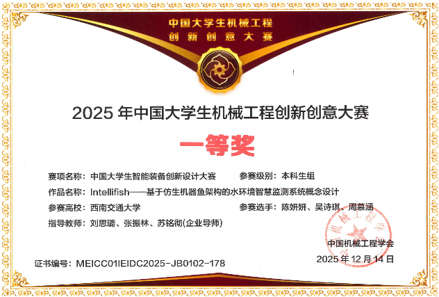 在激烈角逐中,由学校学生创新实践中心(创新创业学院)刘思璐老师等指导的本科生组作品《Intelifish——基于仿生机器鱼架构的水环境智慧监测系统概念设计》表现优异,荣获全国一等奖。此次获奖实现了中心(学院)在该赛事本科生组“零的突破”。