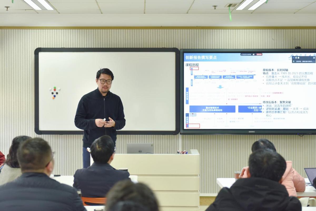 李成坚结合本人获得全国教创赛一等奖经历及相关评审经验,作题为“为教而创,为赛而砺”的分享。她从参赛与评赛双重视角提出“强、新、实、畅”四字策略,为备赛提供系统指引。其中,“强”是备赛根基,核心在于苗子遴选,需兼顾课程、主讲教师、成果要素,她建议参赛教师以高水平课程建设与扎实教改成果增强说服力,提前系统整理创新周期内的代表性成果与数据证据。谈及“新”与“实”,李成坚指出,“新”要求精准把握赛事精神与赛道内涵,落实课程思政与“四新”建设要求,从真实教学问题出发,聚焦一门课开展系统创新。而“实”强调创新落地,避免概念化表达,要构建从问题到措施再到成效的叙述体系,并用评教、学习表现等多维数据佐证成效,做到逻辑自洽、精准回应教学痛点。关于现场汇报,她强调要做到“畅”,即汇报要做到流畅灵动,兼具表现力与感染力。