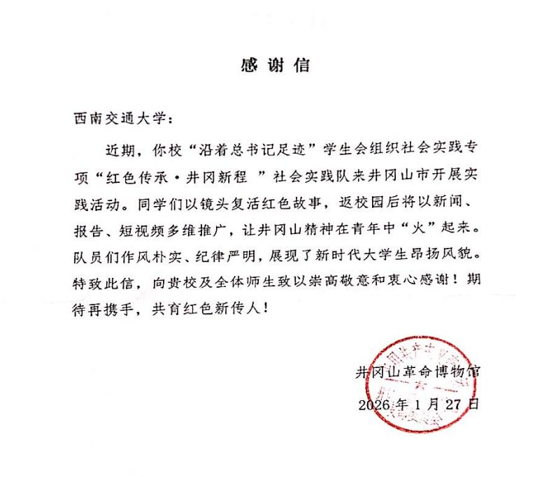为深入贯彻落实习近平总书记关于“用好红色资源、传承红色基因”的重要指示精神,响应学校2026年寒假“返家乡”社会实践的号召,利兹学院“红色传承井冈新程”实践队于寒假期间赴江西省吉安市井冈山市开展“沿着习近平足迹”校级专项重点学生会组织实践项目。5名实践队员走访5处红色教育基地,以沉浸式体验、青年化表达的方式,在红土圣地中筑牢理想信念,在实际行动上践行新时代青年的青春担当。