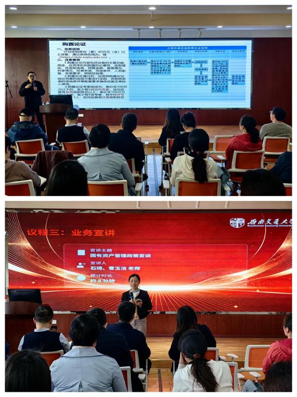 政策宣讲环节,石琦、曹玉洁围绕国有资产管理相关政策为老师们展开了详细的讲解,重点介绍了资产入账、购置论证、资产验收等日常管理办法,以及大型仪器设备的规范管理等规定。