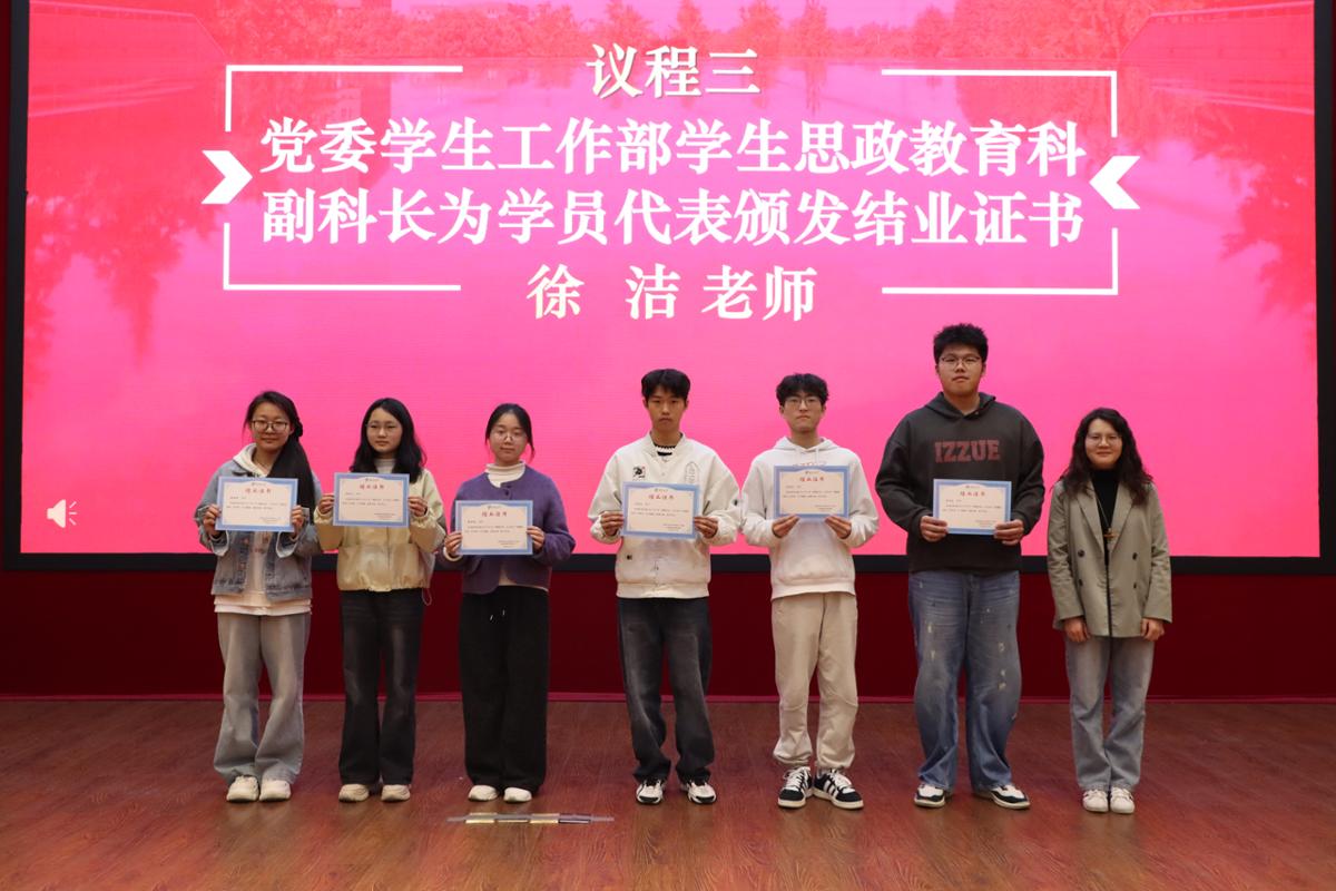 党委学生工作部学生思政教育科副科长徐洁为学员代表颁发结业证书,全体学员圆满完成培训。