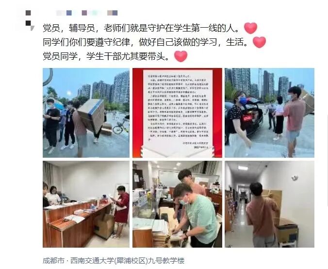 每一位同学都是学院的“掌中宝”、“心头肉”,了解清楚学生的具体情况、特殊情况,便于老师做好管理与服务。校内、校外,成都、外地,有无特殊情况……学院2646名学生的各项情况学院老师均摸排掌握清楚,对于某些有特殊情况的同学,如生病的学生,及时与学校沟通联系,辅导员陪同处理,在防疫政策的许可条件下,积极帮助学生处理相关问题,无论如何,辅导员老师均陪伴在同学们的身边。辅导员互相交流分享好用的小程序,用于进行信息的收集、整理等工作。辅导员们各类有趣的、温暖的、严格的花式提醒、通知、要求、政策解释,给同学们在严格的防疫过程中带来一丝温暖与欢乐,师生距离更加贴近了。
