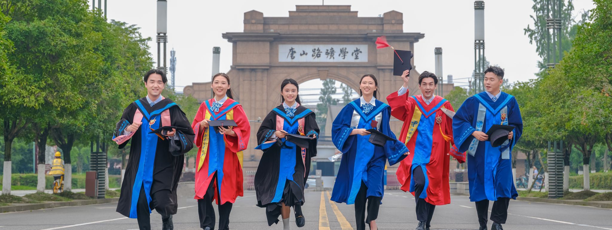 新版学位服由学位袍、垂布、学位帽、绶带、徽章五部分组成,融入交大元素和交大色彩,每一部分都呈现出独具西南交大特色的印记。