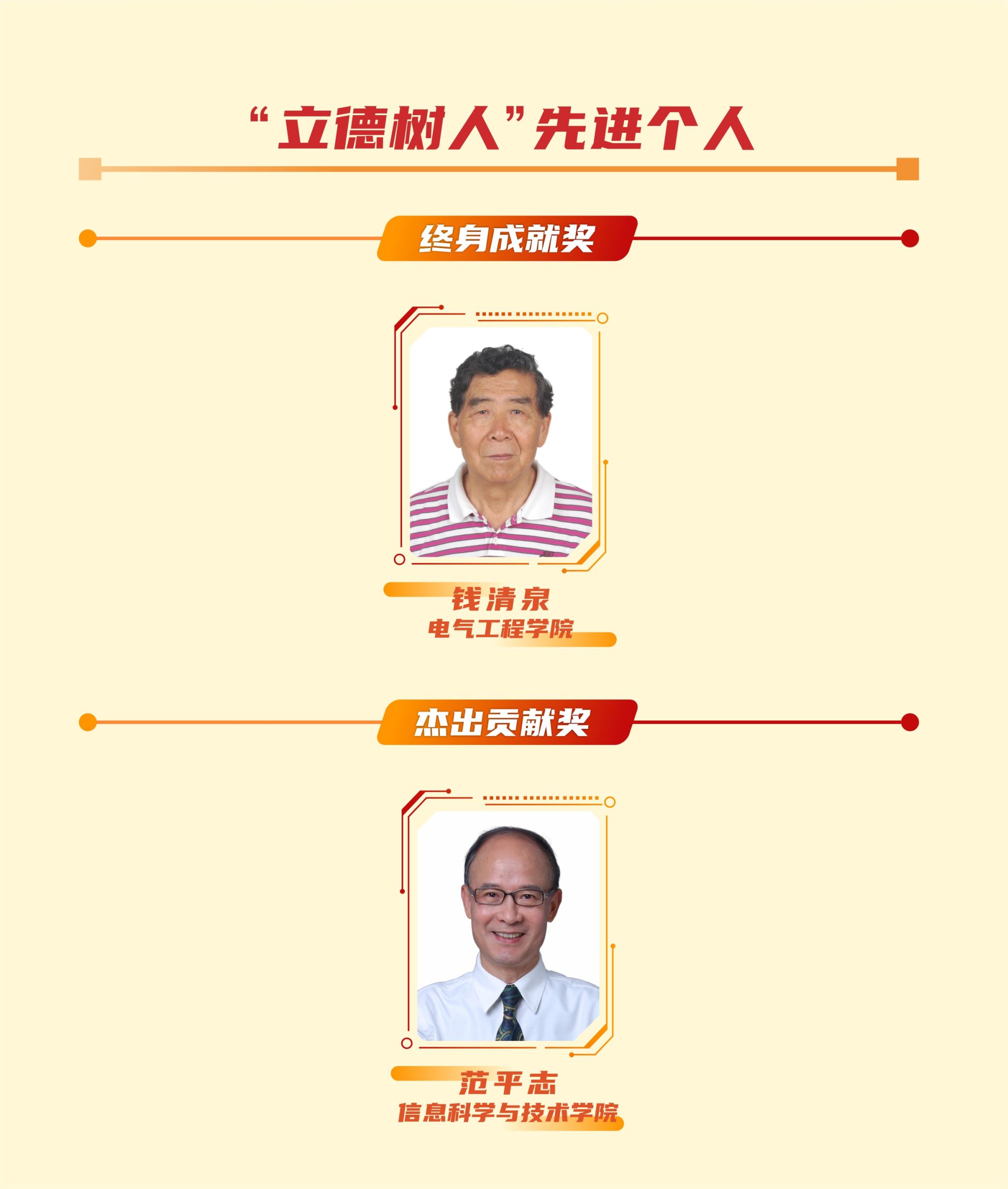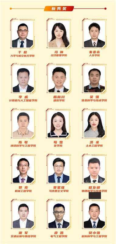 为表彰先进,弘扬尊师重教良好风尚,进一步增强广大教师的荣誉感和责任感,学校党委决定,授予8个集体“西南交通大学‘立德树人’先进集体”称号,授予1名教师“西南交通大学‘立德树人’终身成就奖”称号,授予1名教师“西南交通大学‘立德树人’杰出贡献奖”称号,授予9名教师“西南交通大学‘立德树人’标兵奖”称号,授予15名教师“西南交通大学‘立德树人’新秀奖”称号,授予9名教师“西南交通大学‘思国奖’”。他们的先进事迹,是“以学生为中心、以教师为主体”的办学理念在学校落地生根的生动实践,充分彰显了新时代交大教师立德修身、潜心治学、爱岗敬业、无私奉献的优秀品质和精神风貌。