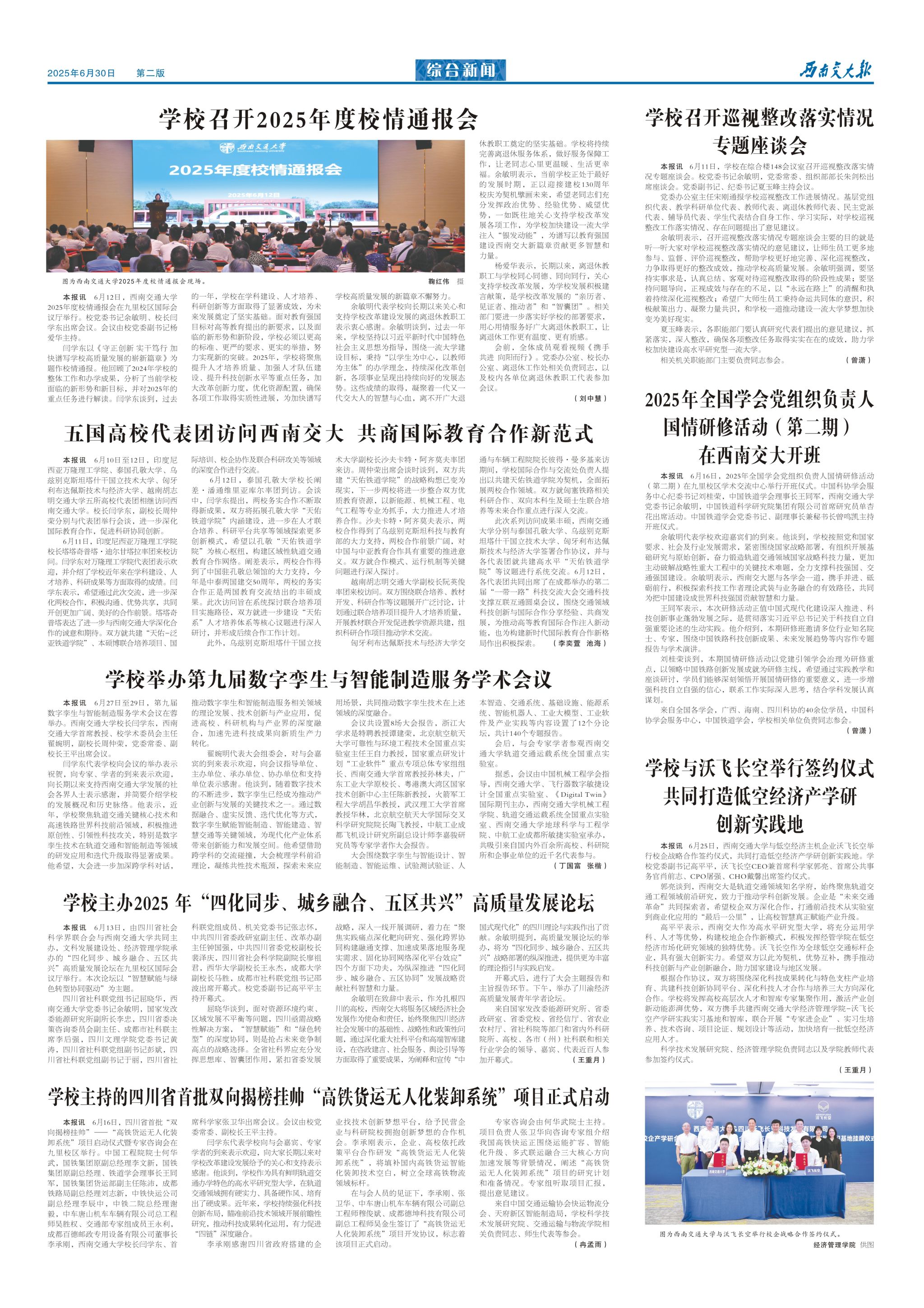 学校召开2025年度校情通报会本报讯 6月12日,西南交通大学2025年度校情通报会在九里校区国际会议厅举行。校党委书记余敏明、校长闫学东出席会议。会议由校党委副书记杨爱华主持。闫学东以《守正创新 实干笃行 加快谱写学校高质量发展的崭新篇章》为题作校情通报。他回顾了2024年学校的整体工作和办学成果,分析了当前学校面临的新形势和新目标,并对2025年的重点任务进行解读。闫学东谈到,过去的一年,学校在学科建设、人才培养、科研创新等方面取得了显著成效,...编辑:焦雪 作者:刘中慧