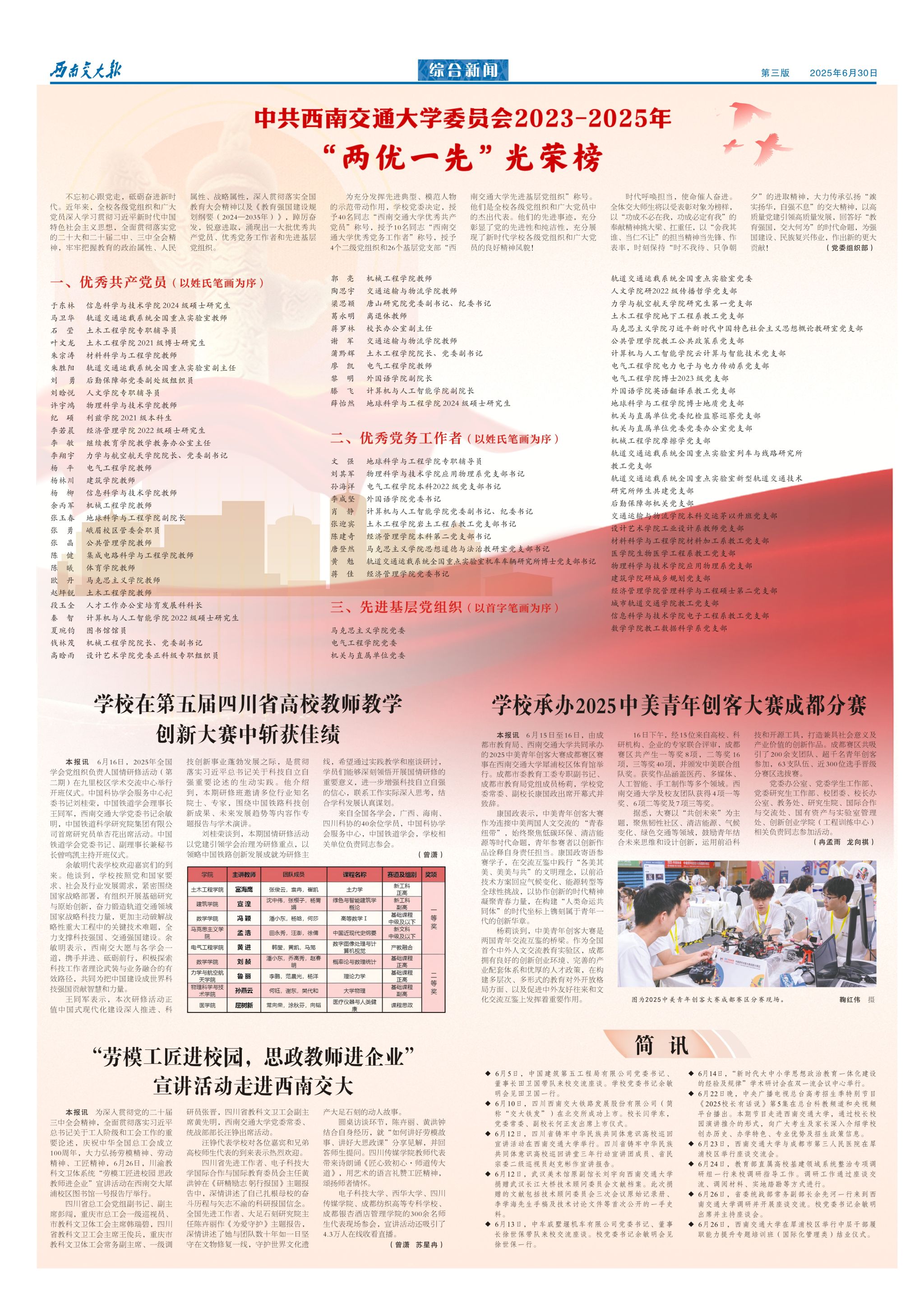 中共西南交通大学委员会2023—2025年“两优一先”光荣榜不忘初心跟党走,砥砺奋进新时代。近年来,全校各级党组织和广大党员深入学习贯彻习近平新时代中国特色社会主义思想,全面贯彻落实党的二十大和二十届二中、三中全会精神,牢牢把握教育的政治属性、人民属性、战略属性,深入贯彻落实全国教育大会精神以及《教育强国建设规划纲要(2024—2035年)》,踔厉奋发,锐意进取,涌现出一大批优秀共产党员、优秀党务工作者和先进基层党组织。为充分发挥先进典型、模范人物的示范带动作用,学校党委决定,...编辑:焦雪 作者: