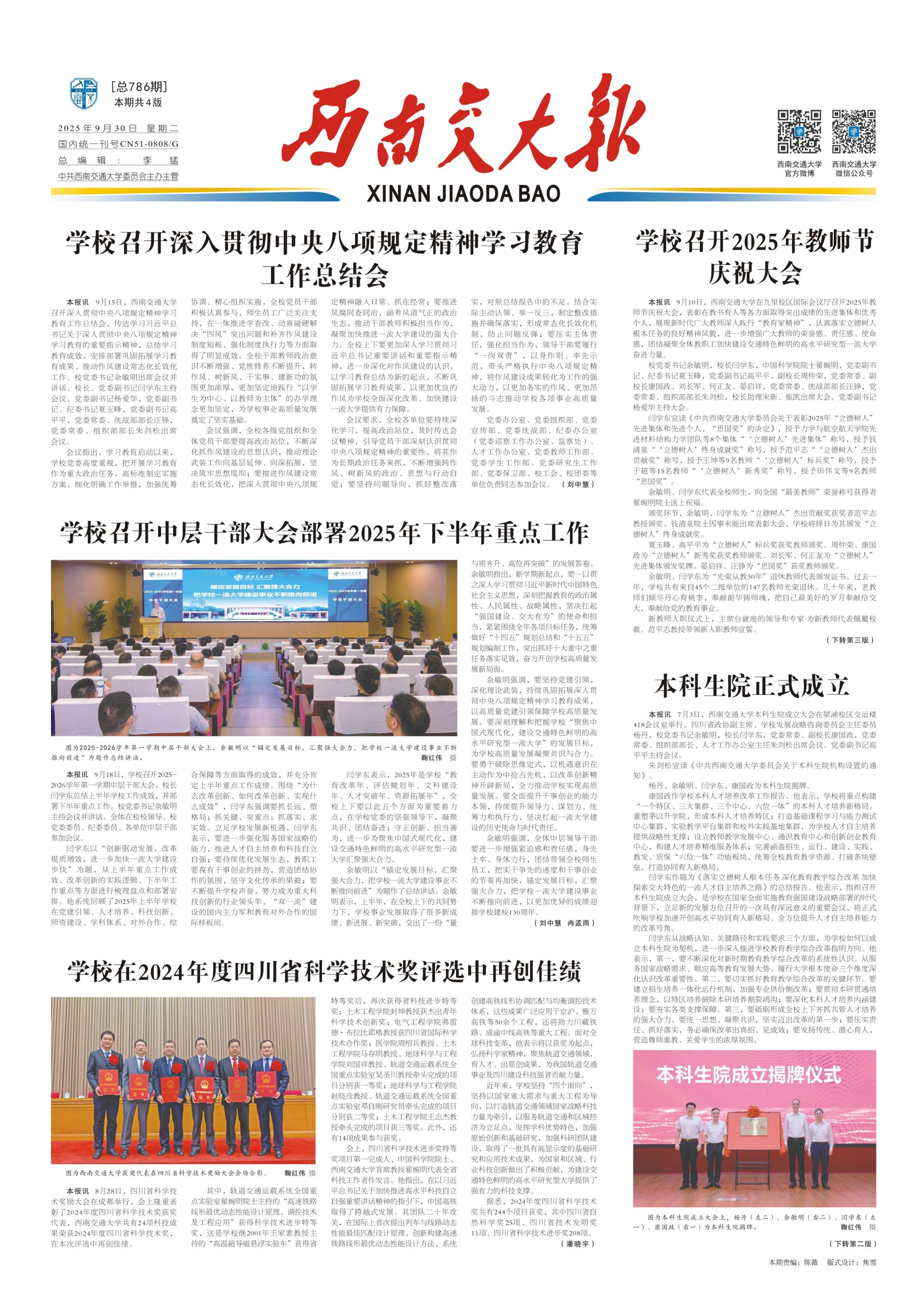 本报讯 9月10日,西南交通大学在九里校区国际会议厅召开2025年教师节庆祝大会,表彰在教书育人等各方面取得突出成绩的先进集体和优秀个人,展现新时代广大教师深入践行“教育家精神”,认真落实立德树人根本任务的良好精神风貌,进一步增强广大教师的荣誉感、责任感、使命感,团结凝聚全体教职工加快建设交通特色鲜明的高水平研究型一流大学奋进力量。校党委书记余敏明,校长闫学东,中国科学院院士翟婉明,党委副书记、纪委书记夏玉峰,...