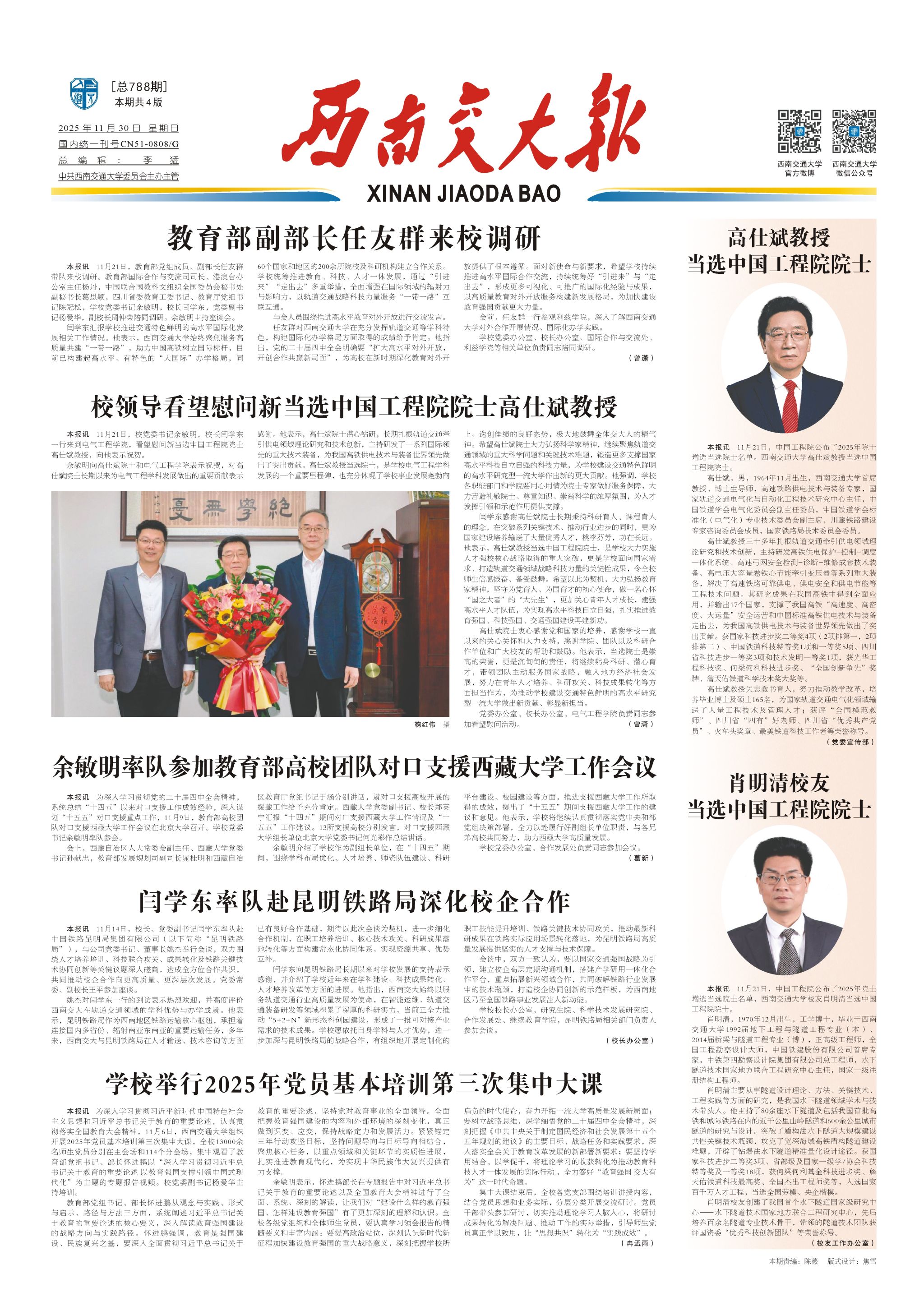 高仕斌教授当选中国工程院院士本报讯 11月21日,中国工程院公布了2025年院士增选当选院士名单。西南交通大学高仕斌教授当选中国工程院院士。高仕斌,男,1964年11月出生,西南交通大学首席教授、博士生导师,高速铁路供电技术与装备专家,国家轨道交通电气化与自动化工程技术研究中心主任,中国铁道学会电气化委员会副主任委员,中国铁道学会标准化(电气化)专业技术委员会副主席,川藏铁路建设专家咨询委员会成员,国家铁路局技术委员会委员。高仕斌教授三十多年扎根轨道交通牵引供电领域理论研究和技术创新,...编辑:焦雪 作者: