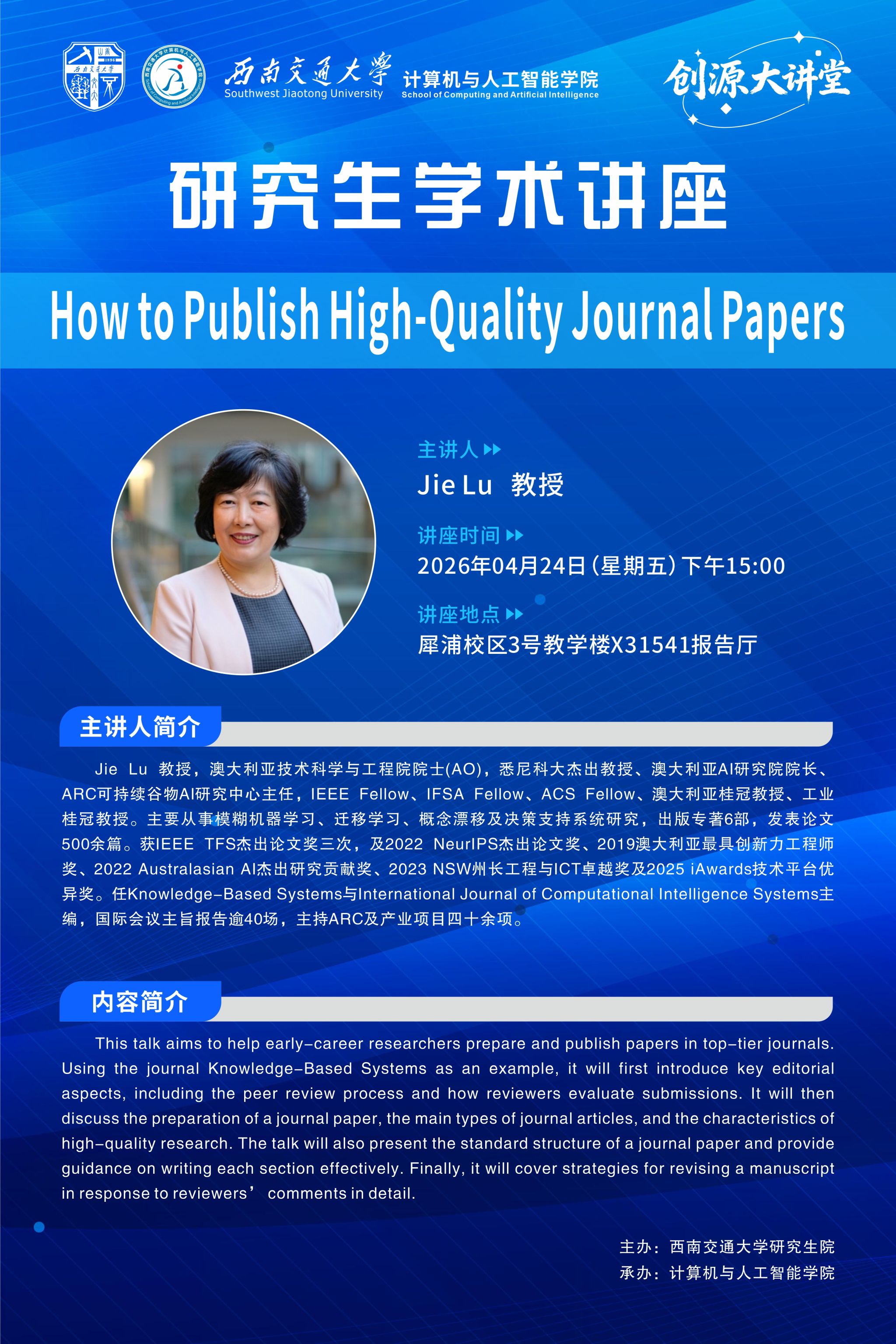 【创源大讲堂】How to Publish High-Quality Journal Papers计算机与人工智能学院2026年04月24日(星期五)下午15:00犀浦校区3号教学楼X31541报告厅Jie Lu 教授内容简介 -
