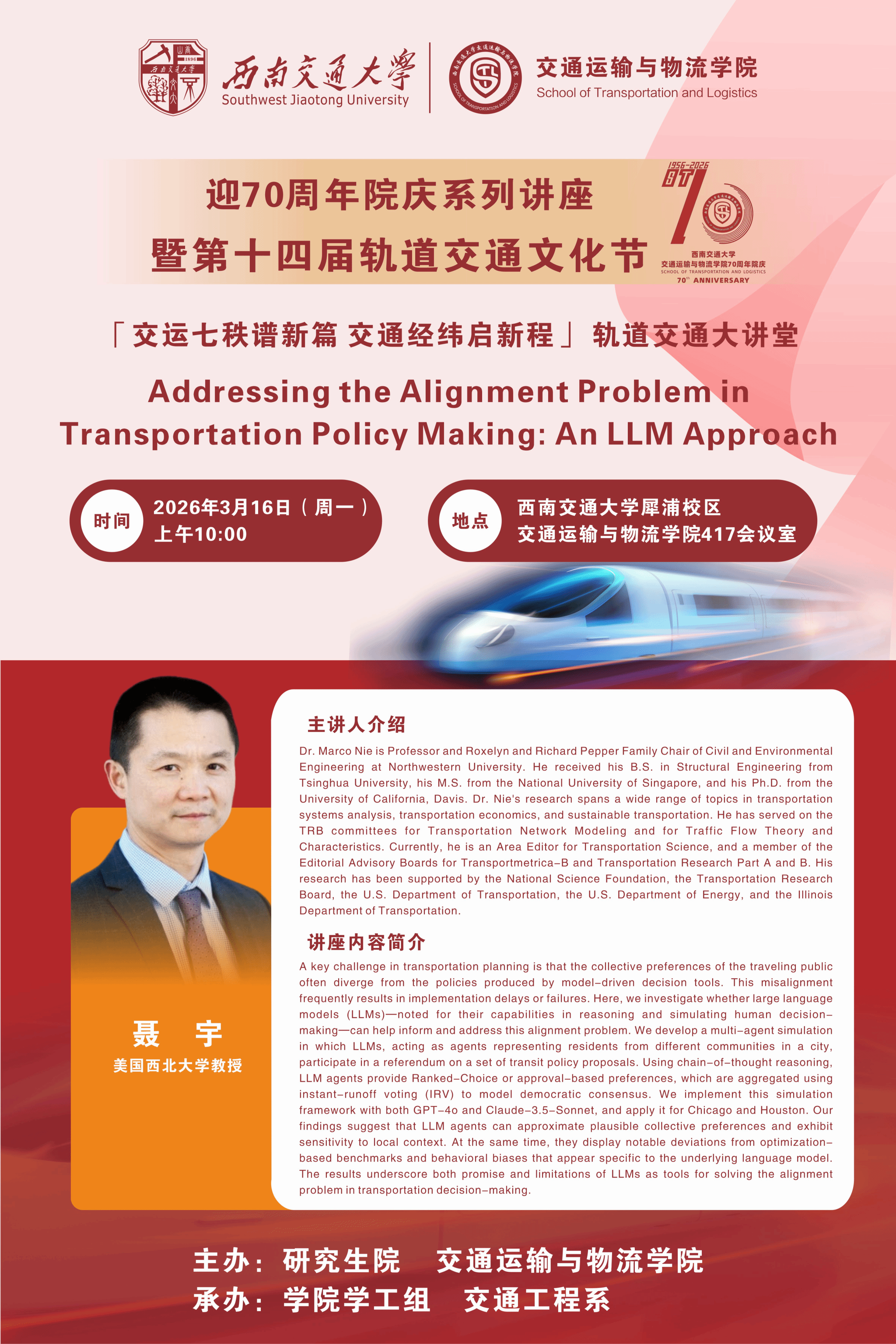 【创源大讲堂】Addressing the Alignment Problem in Transportation Policy Making: An LLM Approach交通运输与物流学院2026年3月16日(周一)上午10:00西南交通大学犀浦校区交通运输与物流学院417学术报告厅聂宇 美国西北大学教授内容简介 -