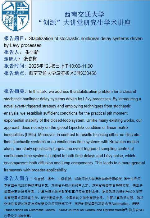 【学术讲座】Stabilization of stochastic nonlinear delay systems driven by Lévy processes数学学院2025年12月5日上午10:00-11:00西南交通大学犀浦校区3教X30456朱全新内容简介 -
