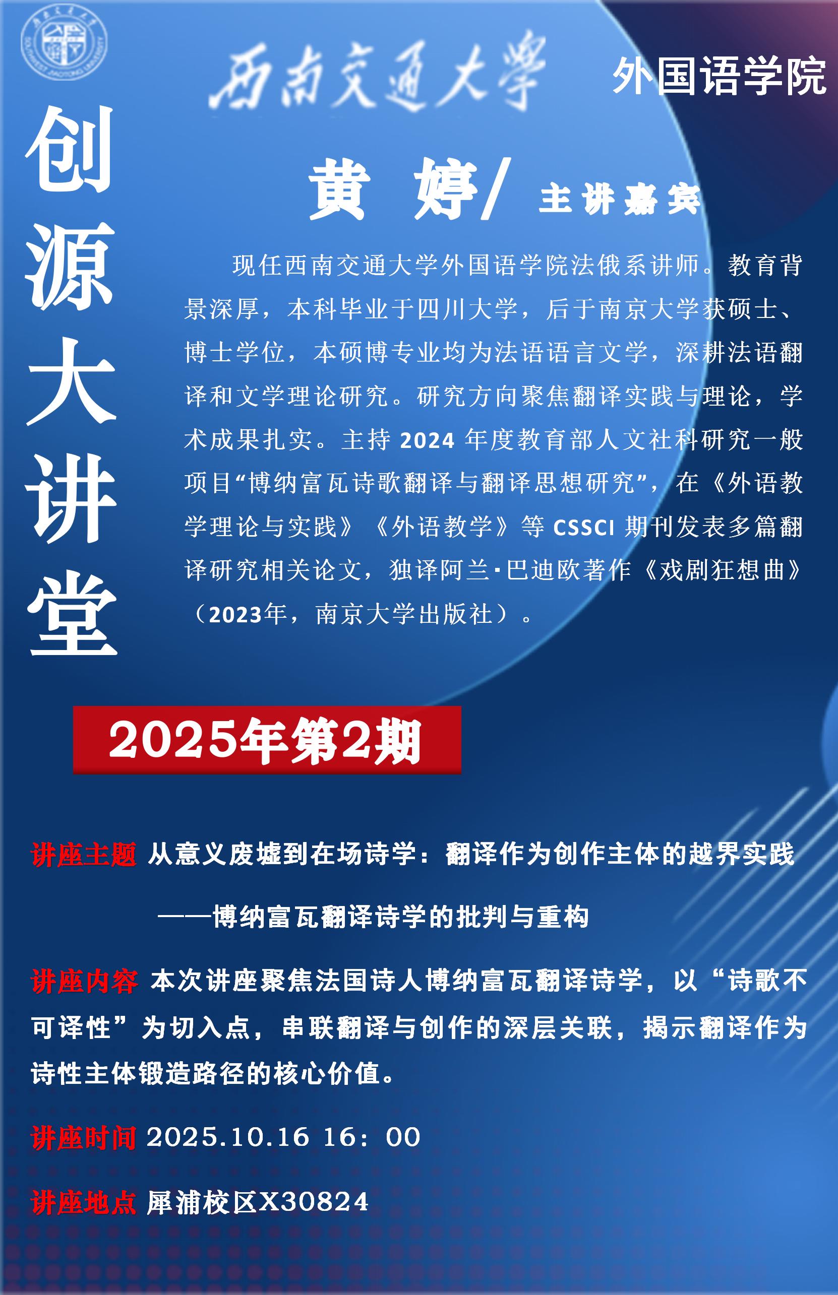 【创源大讲堂】从意义废墟到在场诗学:翻译作为创作主体的越界实践——博纳富瓦翻译诗学的批判与重构外国语学院2025年10月16日 16:00犀浦校区X30824黄 婷内容简介本次讲座聚焦法国诗人博纳富瓦翻译诗学,以“诗歌不可译性”为切入点,串联翻译与创作的深层关联,揭示翻译作为诗性主体锻造路径的核心价值。 -