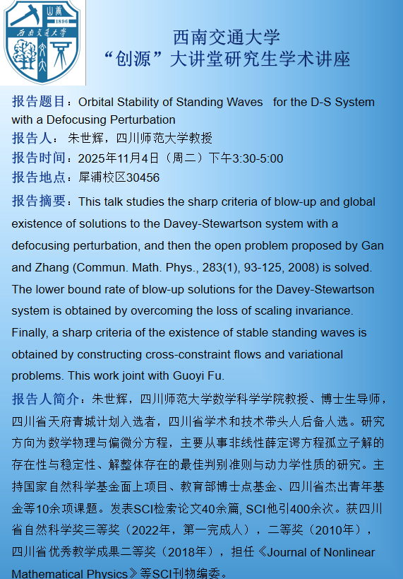 学术讲座:Orbital Stability of Standing Waves for the D-S System with a Defocusing Perturbation数学学院2025年11月4日(周二)下午3:30-5:00X30456朱世辉内容简介 -