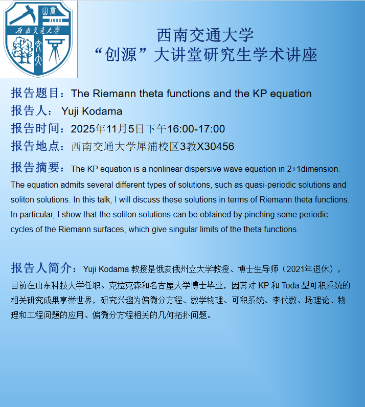 学术讲座:The Riemann theta functions and the KP equation数学学院2025年11月5日下午16:00-17:00犀浦校区3教X30456Yuji Kodama内容简介 -